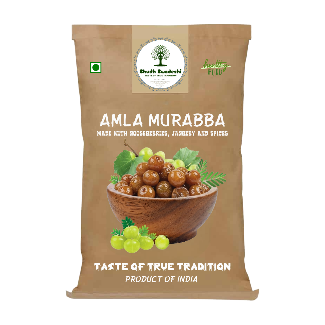 Experience the goodness of Ayurveda with Shudh Swadeshi Amla Murabba, a classic Indian sweet preserve made from fresh Indian gooseberries (Amla) slowly cooked in Jaggery syrup and delicately flavored with cardamom, ginger, and black salt. Prepared using traditional methods, this murabba retains the natural nutrients of amla while offering a perfectly balanced sweet-and-tangy taste.