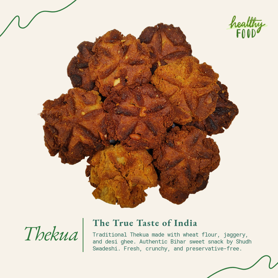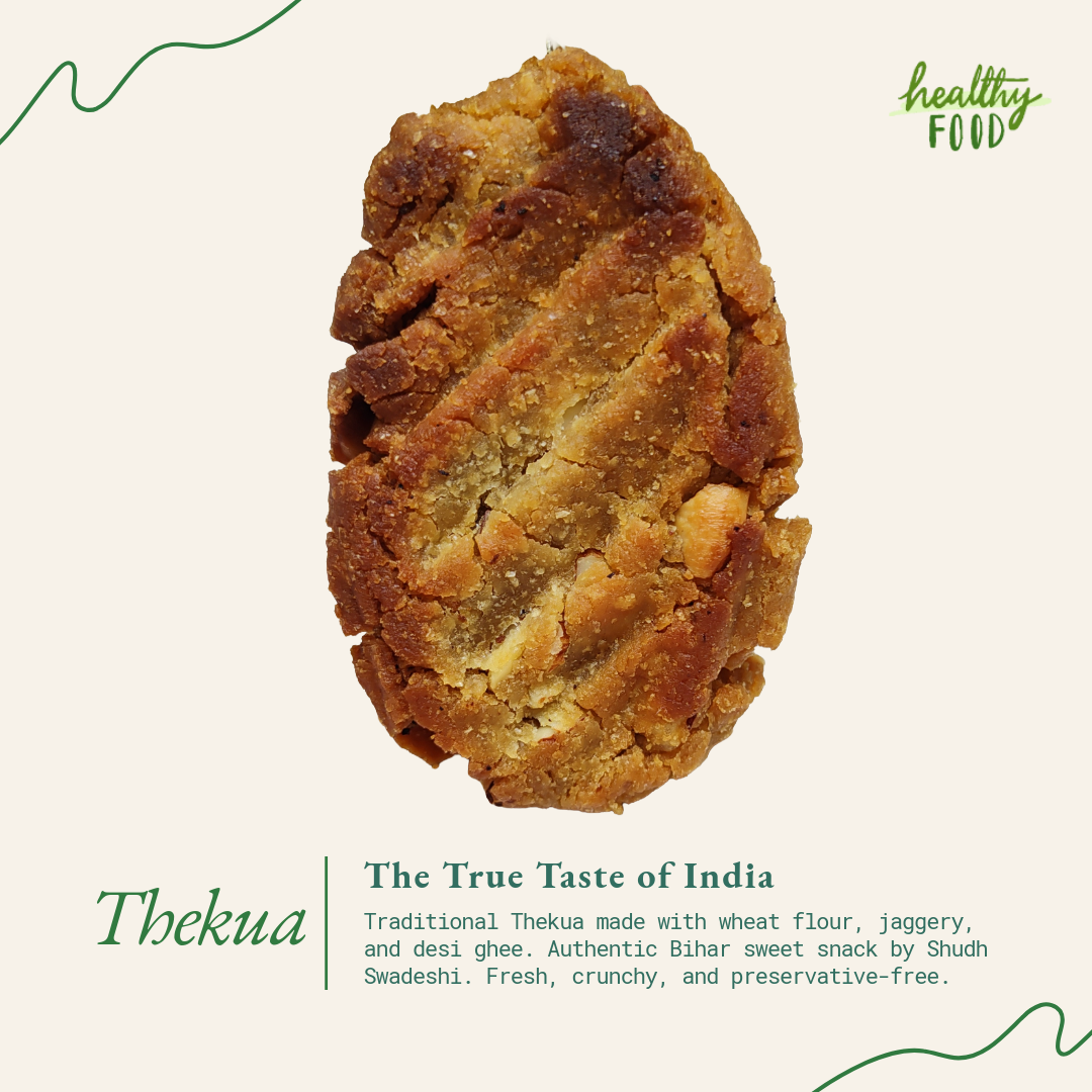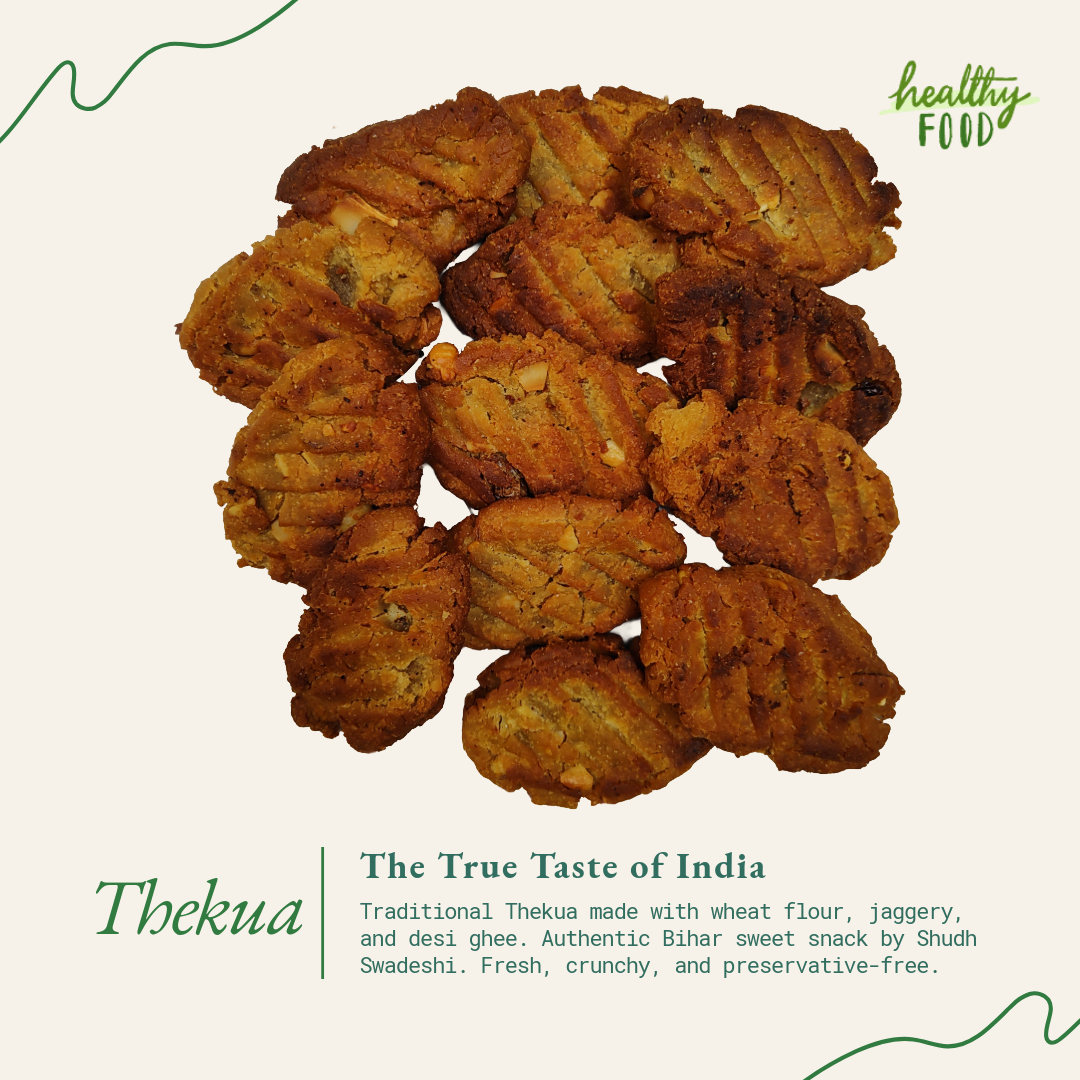 Shudh Swadeshi Thekua is a traditional Indian sweet snack made with whole wheat flour, jaggery, and pure ghee. Crispy on the outside and soft within, Thekua is a timeless delicacy enjoyed across Bihar and Eastern India.