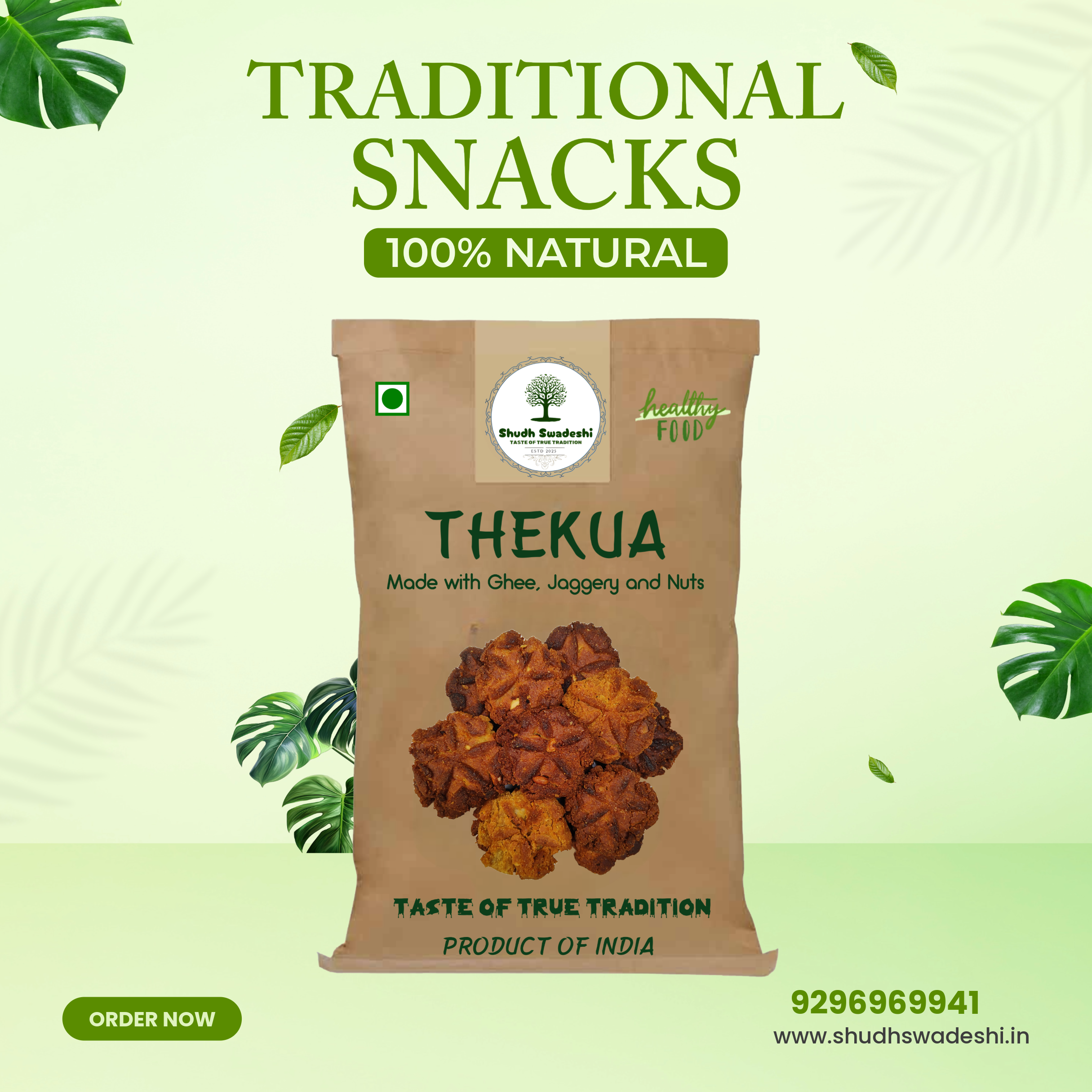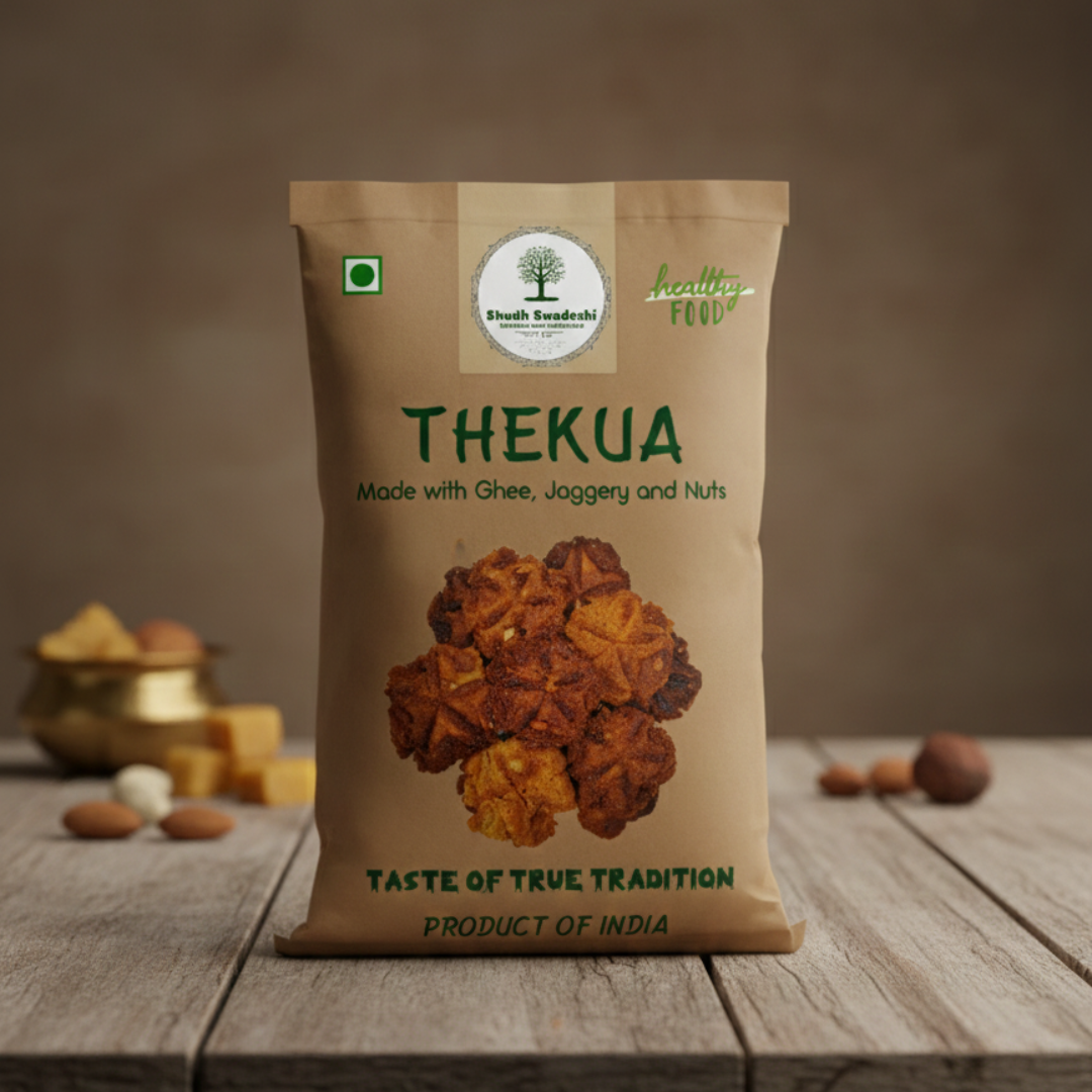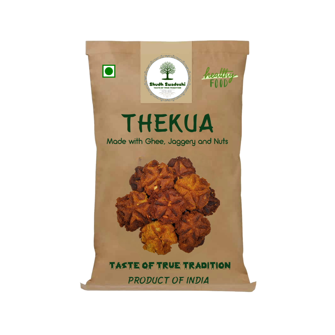 Shudh Swadeshi Thekua is a traditional Indian sweet snack made with whole wheat flour, jaggery, and pure ghee. Crispy on the outside and soft within, Thekua is a timeless delicacy enjoyed across Bihar and Eastern India.
